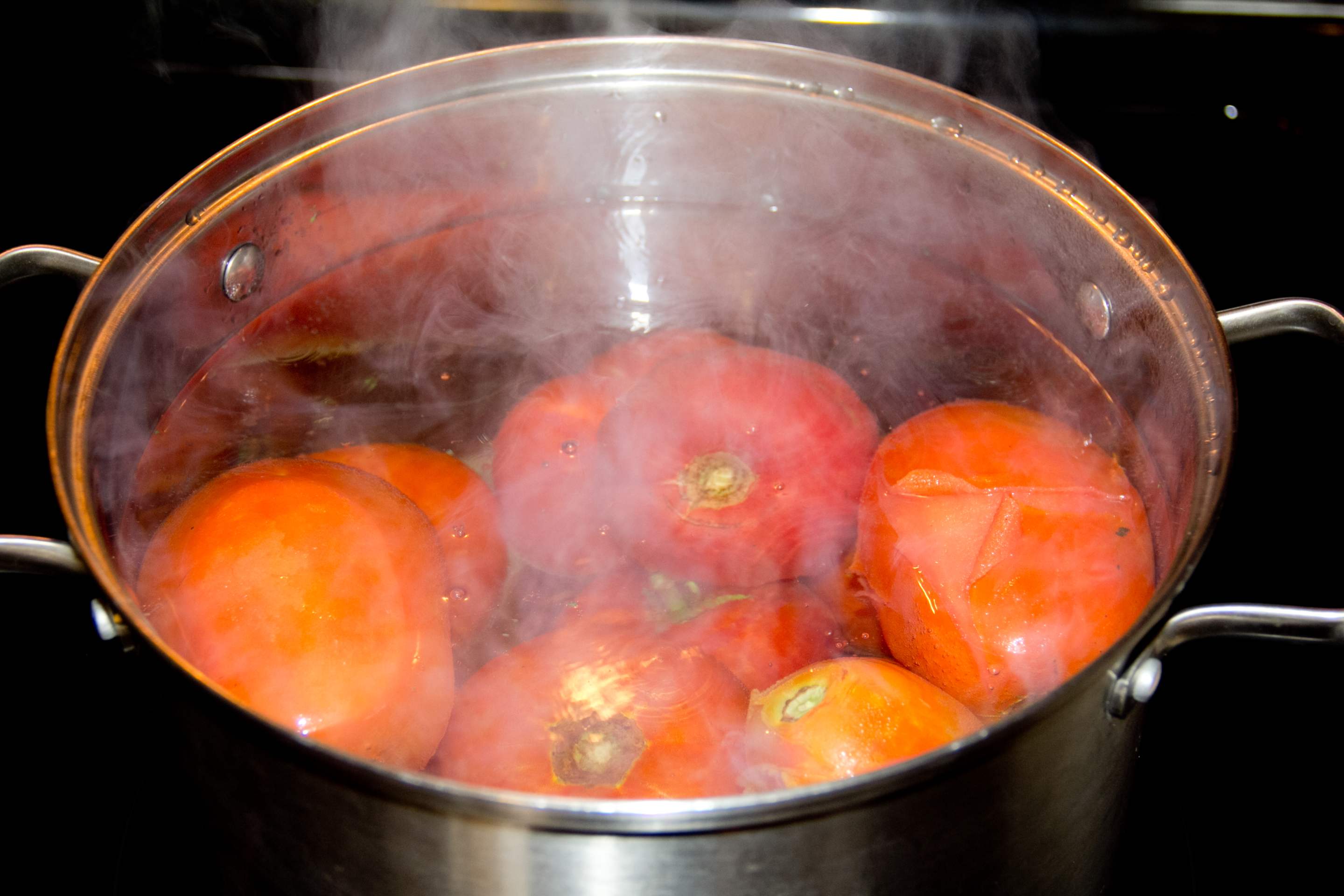 Boil water in a big stock pot. When the water is boiling, put in as many tomatoes as will fit and boil for 4-5 minutes. This will loosen the skins, making them easy to peel.
