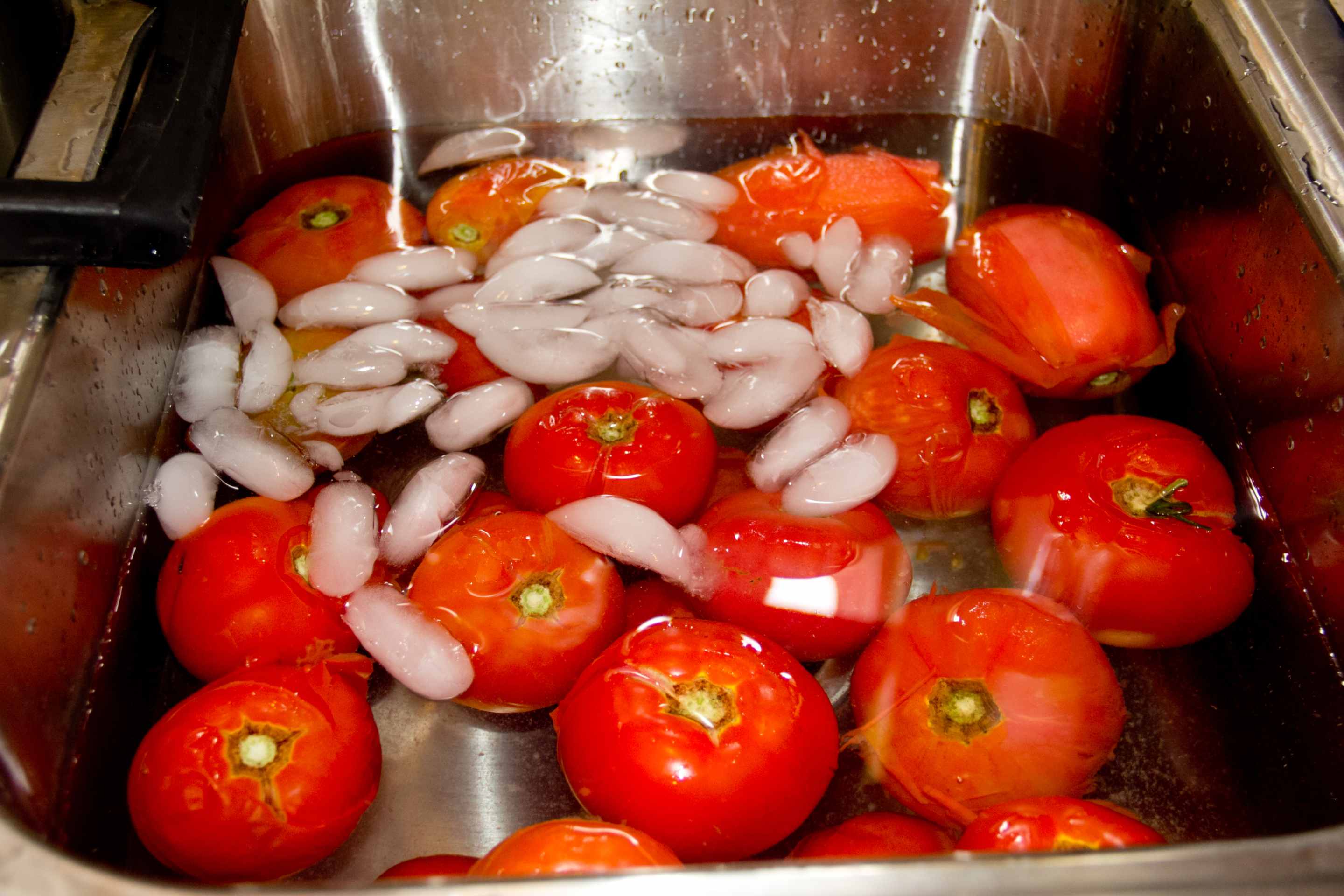 When the 4-5 minutes are up, take the tomatoes out of the pot – you can use tongs or a big, slotted spoon – and put them in an ice bath. They can stay in the cold water while you work on peeling each tomato. Repeat these steps for the rest of your tomatoes.