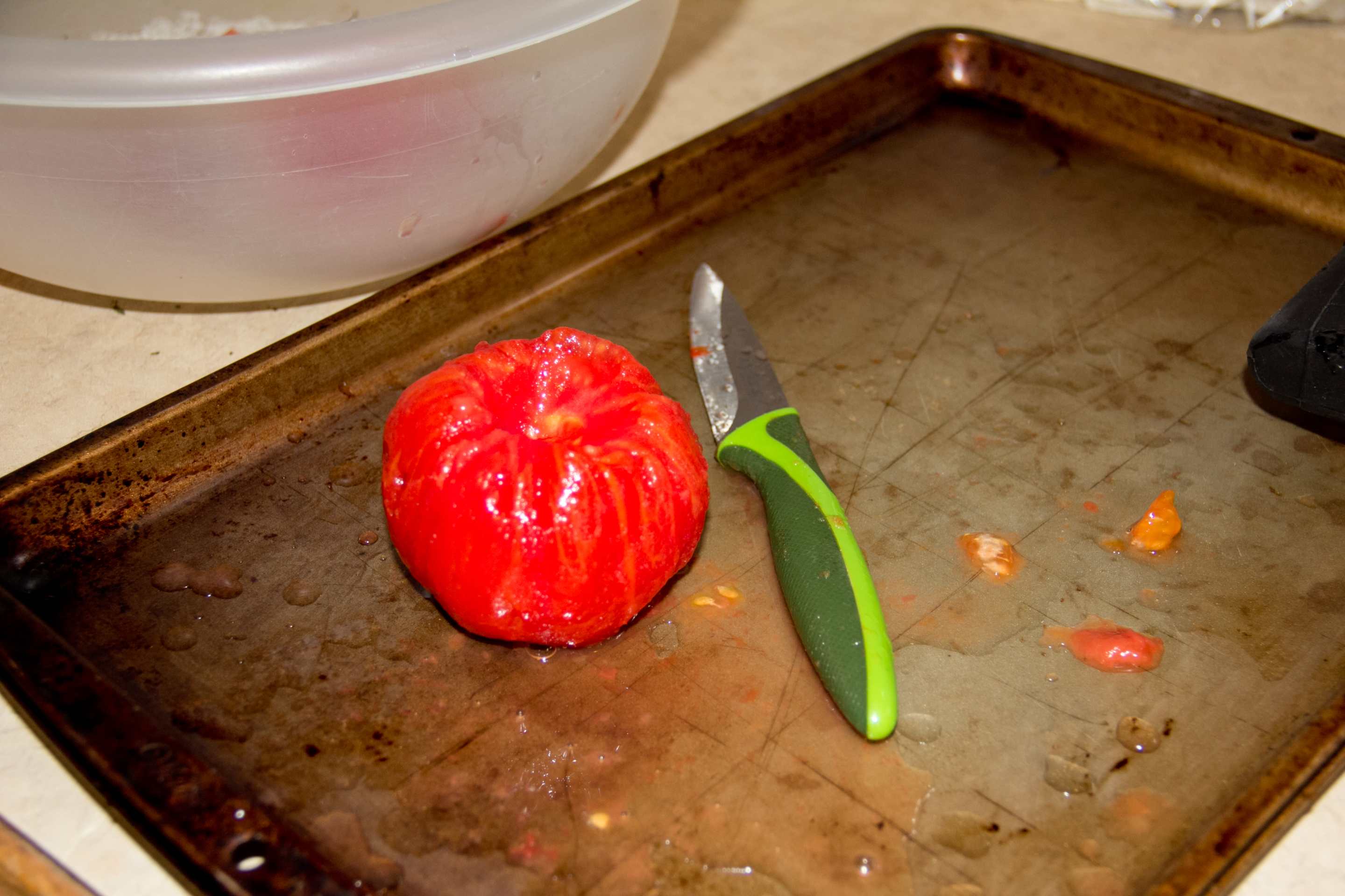 In between putting tomatoes into boiling water and then into the ice bath, you can start coring and peeling the tomatoes. After your core and peel a tomato, cut it into quarters, then squeeze the juice out of each quarter (I just use my hands) and put it into a colander to drain more while you core, peel, cut, and squeeze the others. You can also put a bowl under the colander to catch the juice that comes off of the tomatoes. You can use this juice in cooking or to drink!