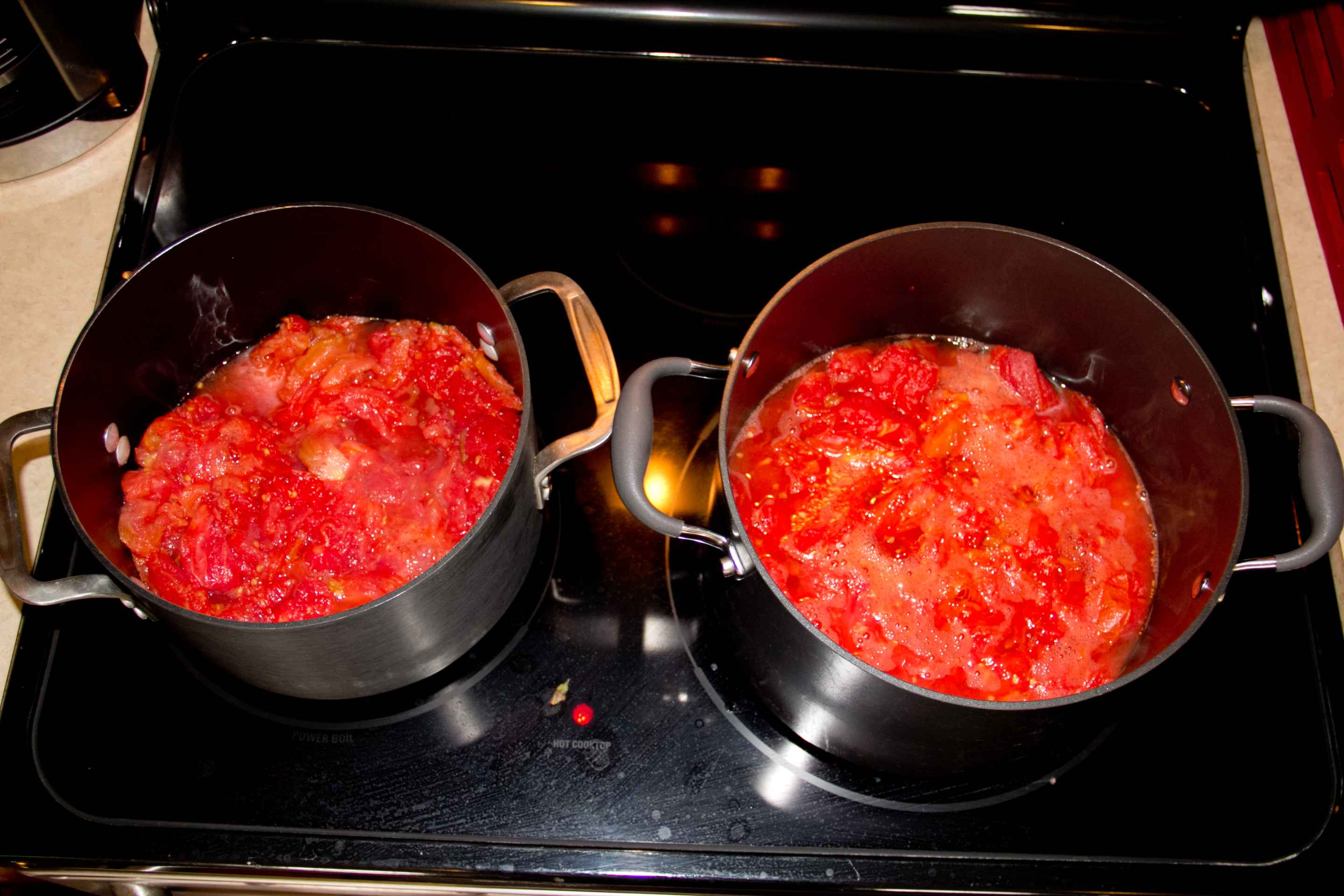 When you’re done boiling, coring, peeling, cutting and squeezing all of your tomatoes, give them a good press in the colander to squeeze out the rest of the juice, then put them into a stock pot. On a side note, if you’d rather not make sauce, you can just freeze or can the squeezed tomaotes for use in soups and stews later. I used two stock pots because I wanted two different flavors of red sauce. Turn the heat on high until the tomatoes start to boil, then reduce the heat to simmer. There really isn’t a way to put a definite time on how long to keep them simmering; just until the tomatoes have a sauce-like consistency. While you’re waiting for the tomatoes to boil down, cut up whatever spices you want to put in your sauce and add them to the pot!